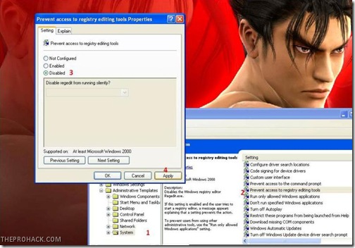 Find “prevent access to registry editing tools” , double click it and change the option to disable.